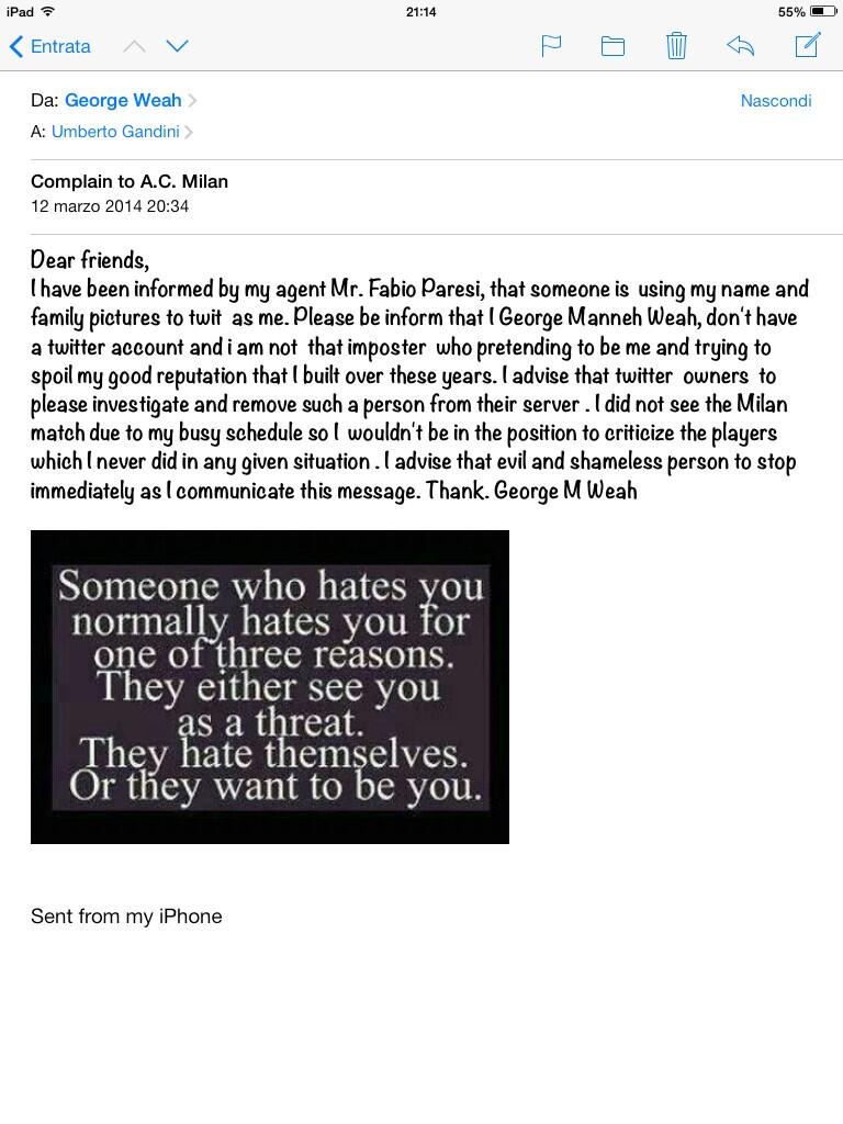 Un profilo giudicato attendibile da tutti i giornalisti sportivi, fino a quando non è arrivata la smentita di un paio di ex procuratori quali Damiani e Parisi, i quali asseriscono d’essere portavoci di George Weah, quello vero.